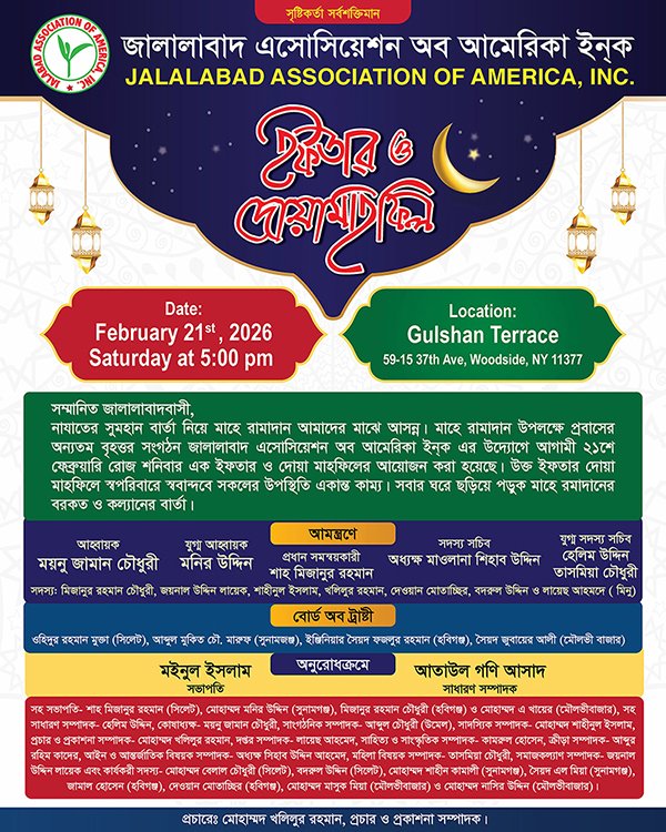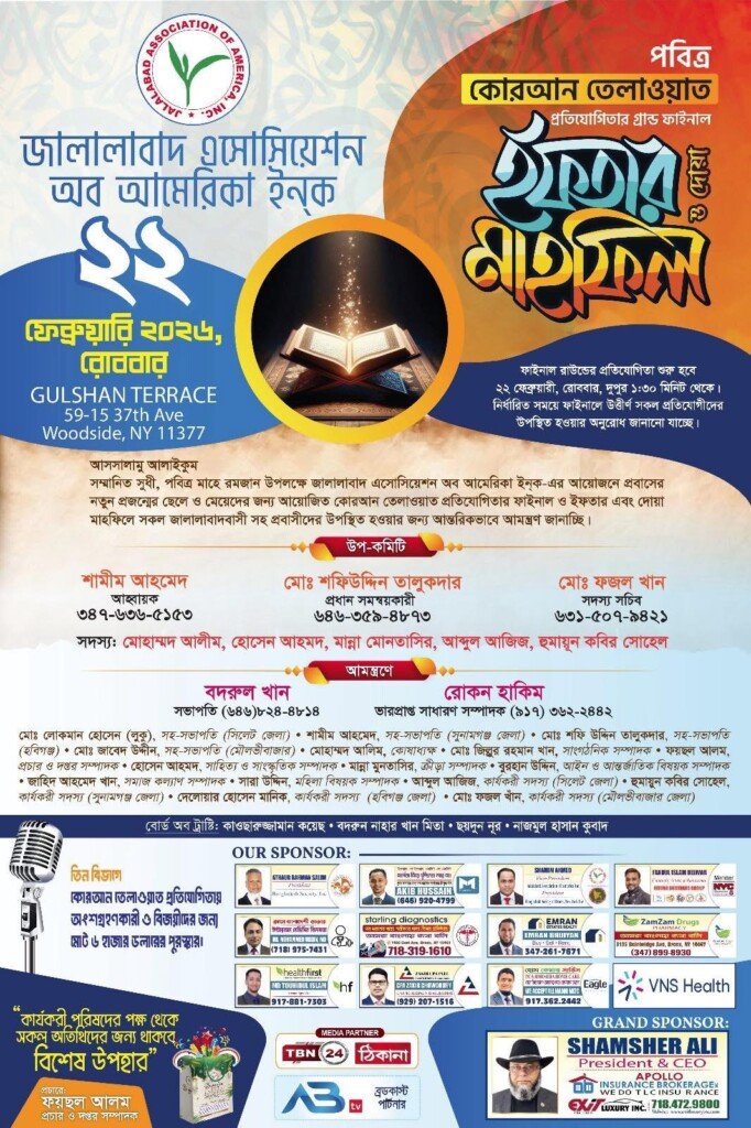 অনাড়ম্বর অনুষ্ঠানে শপথ গ্রহণ করেছেন জ্যামাইকা মুসলিম সেন্টার (জেএমসি) প্রতিষ্ঠিত ইসলামিক শিক্ষা প্রতিষ্ঠান ‘আল মামুর’ স্কুল-এর ২০২৬-২০২৭ সালের নবনির্বাচিত ট্রাষ্টিবোর্ডের সদস্যগণ। রোববার (৮ ফেব্রুয়ারী) দুপুরে আল মামুর স্কুল মিলনায়তনে আয়োজিত অনুষ্ঠানে তারা শপথ গ্রহণ করেন। তাদের শপথ পাঠ করার প্রতিষ্ঠানটির লীডারশীপ কাউন্সিলের চেয়ারম্যান সৈয়দ মোজাফফর। অনুষ্ঠানের শুরুতে পবিত্র কোরআন থেকে...
