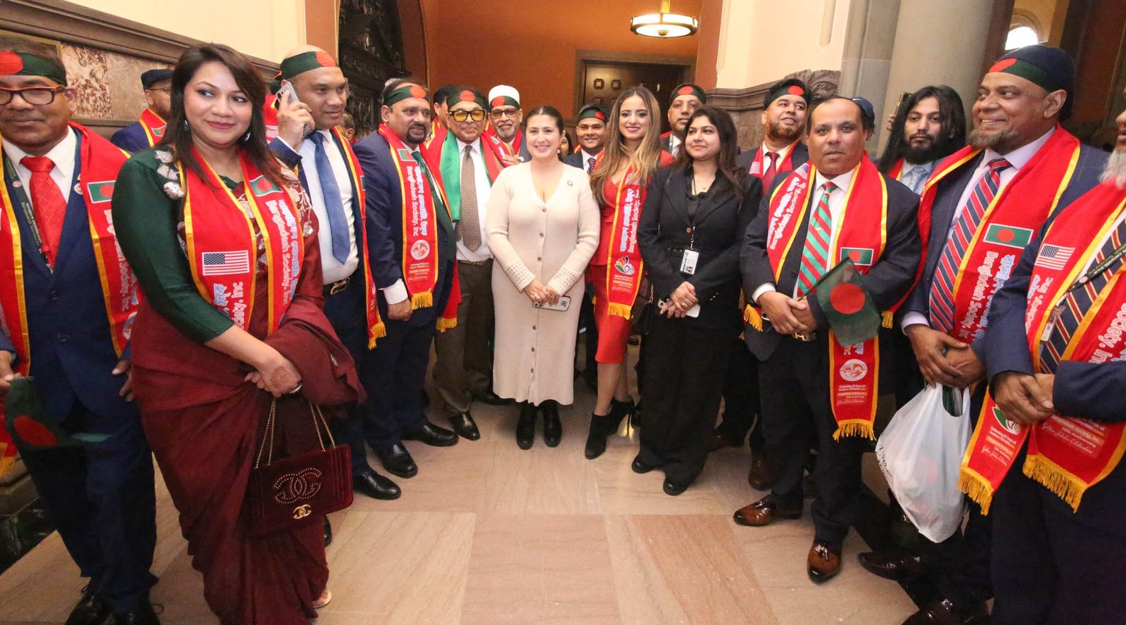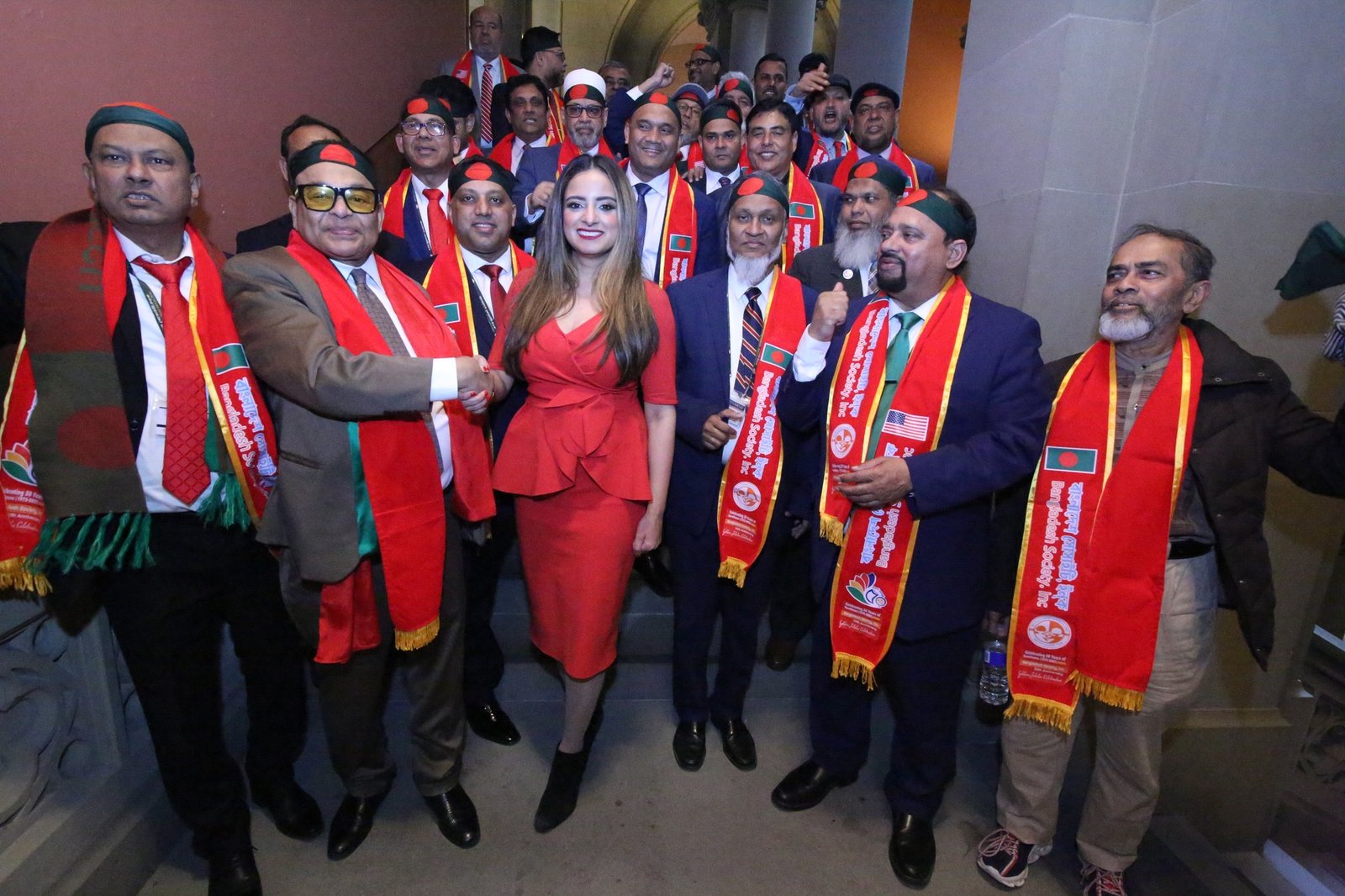 এর আগে দুপুরে বাসযোগে বাংলাদেশ সোসাইটির ট্রাষ্টি বোর্ডের চেয়ারম্যান শাহ নেওয়াজ, সভাপতি আতাউর রহমান সেলিম, সাধারণ মোহাম্মদ আলী, সিনিয়র সহ-সভাপতি মো. মহিউদ্দীন দেওয়ান, ট্রাষ্টি বোর্ড সদস্য আজিমুর রহমান বোরহান, কাজী আজম ও নাঈম টুটুল, জালালাবাদ এসোসিয়েশন অব আমেরিকা’র সভাপতি বদরুল হোসেন খান, বাংলাদেশী আমেরিকান সোসাইটির সাধারণ সম্পাদক আমীন মেহেদী সহ বিভিন্ন কমিউনিটির প্রায় অর্ধশত নেতৃবৃন্দ ও প্রবাসী বাংলাদেশী আলবেনীতে পৌঁছে তাদের স্বাগত জানান অ্যাসেম্বলীওম্যান জেনিফার রাজকুমার।