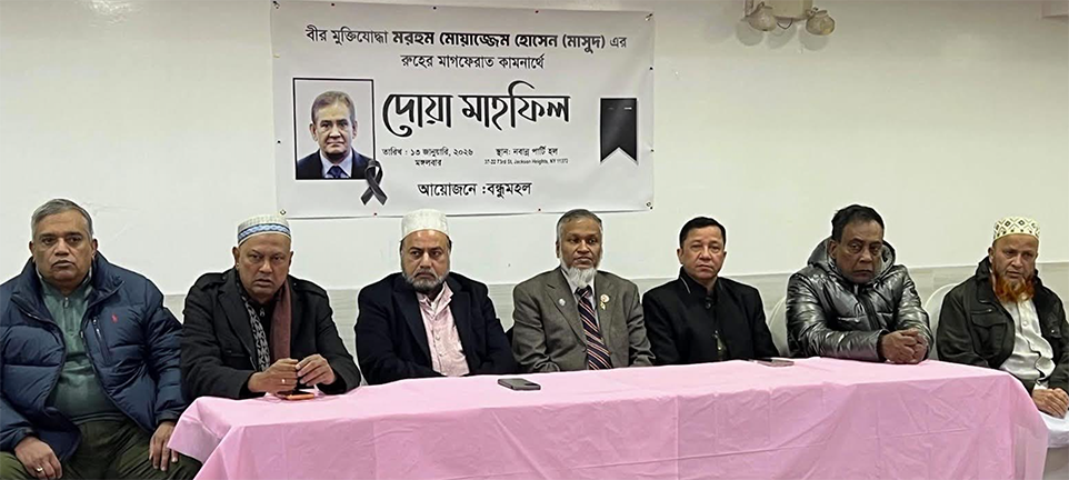 গত ১৩ জানুযারী সন্ধায় জ্যাকসন হাইটসের নবান্ন রেষ্টুরেন্টে ‘বন্ধু মহল’ আয়োজিত স্মরণ সভায় মোয়াজ্জেম হোসেন মাসুদের আত্মত্যাগ ও দেশের প্রতি তার অবদান তুলে ধরা হয়। দোয়া পরিচালনা করেন হাফেজ মাহমুদ।