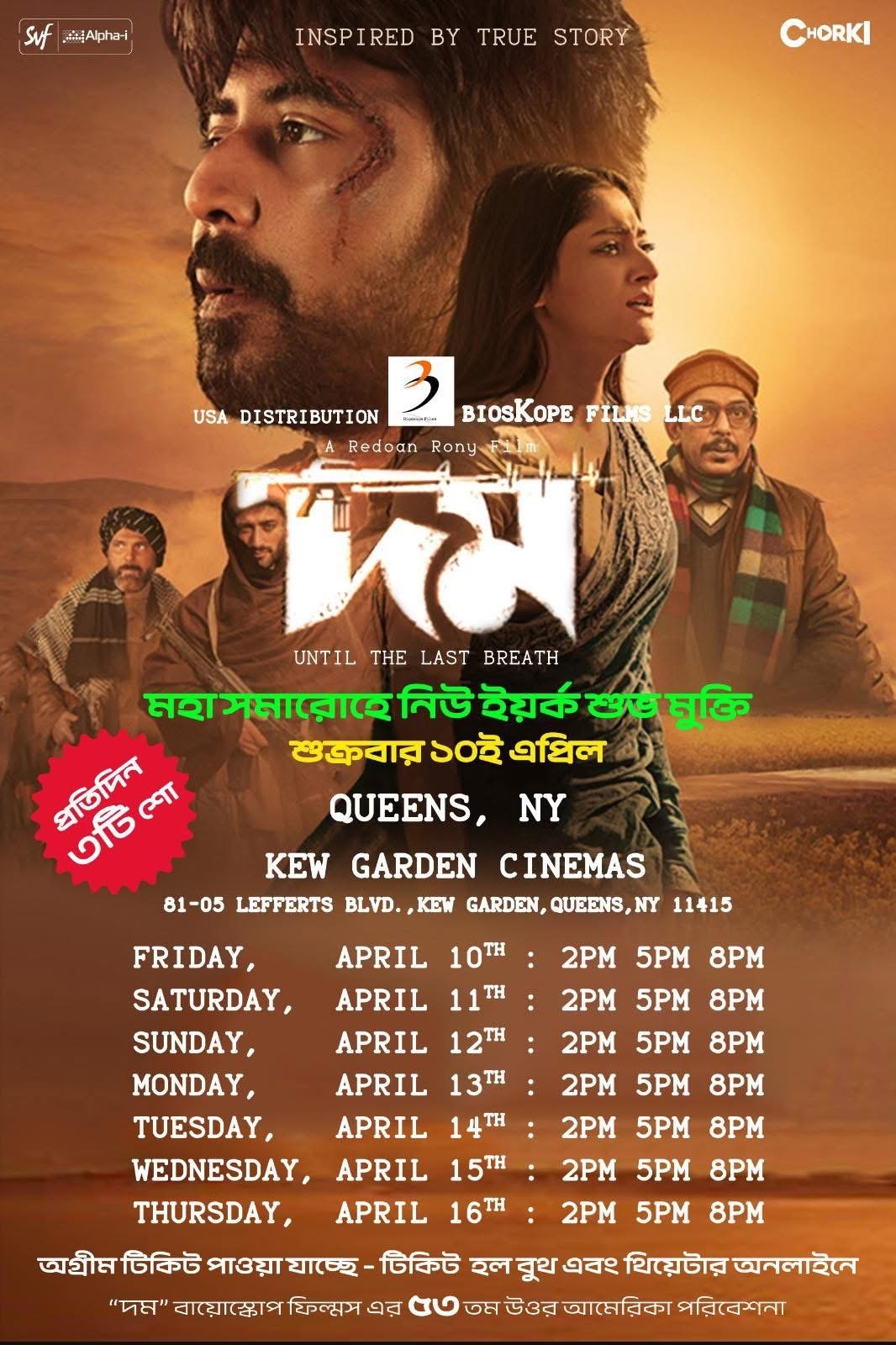 এই দু’টি শহরের সাথে গ্রেটার লস আঞ্জেলেস, এরিজোনা এবং ডেনভার এর দর্শকরাও দেখতে পাচ্ছেন ১০ এপ্রিল শুক্রবার থেকে। এর পর ১৭ এপ্রিল থেকে যুক্তরাষ্ট্রের এবং কানাডা’র ৩০ টি প্রেক্ষাগৃহে মুক্তি পাবে “দম”।