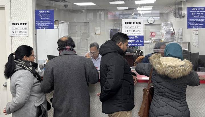 এজন্য রমজানের প্রথম দিনেই গত ১৮ ফেব্রুয়ারী বুধবার নিউইয়র্কে সোনালী এক্সচেঞ্জের জ্যামাইকা শাখায় অর্থ পাঠাতে প্রবাসীদের ভীড় দেখা যায়। ১৫ রোজার পর থেকে দেশে প্রবাসীদের অর্থ প্রেরণের চাপ বাড়বে বলে জানান সোনালী এক্সচেঞ্জের স্থানীয় ম্যানেজার মোহাম্মদ মনিউর রহমান। ছবি: ইউএনএ