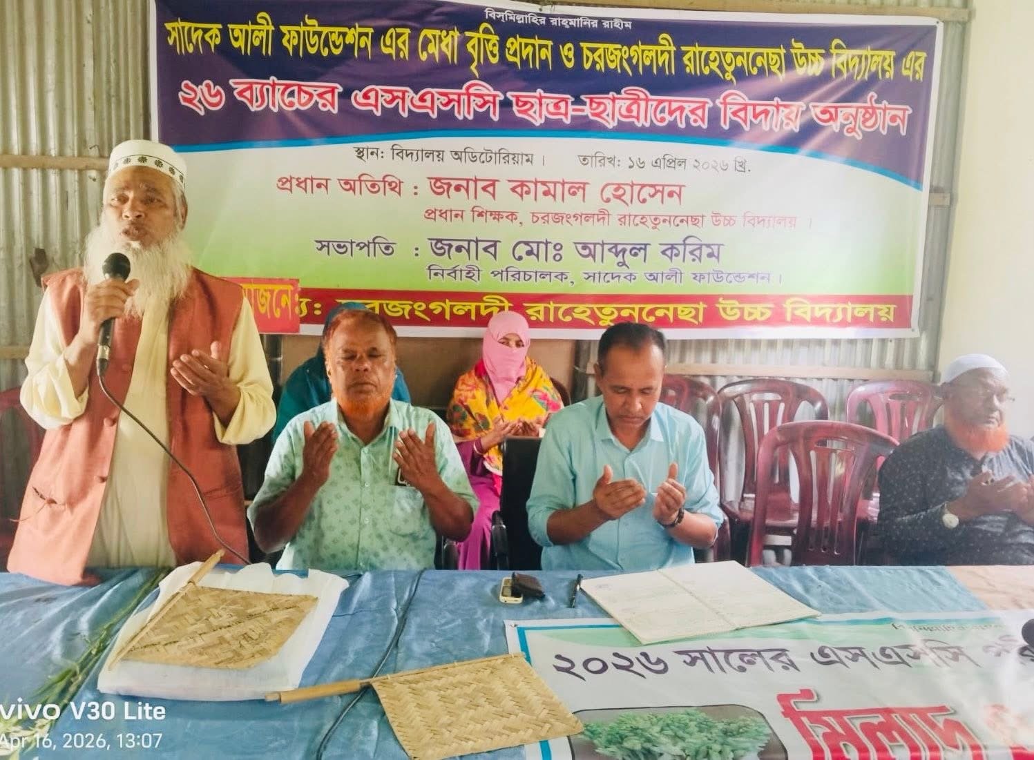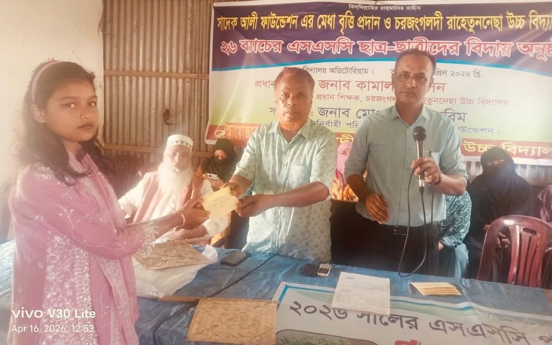 উল্লেখ করা যেতে পারে যে, ২০১৬ সালে নিউইয়র্ক প্রবাসী সাংবাদিক মোঃ আবুল কাশেম সাদেক আলী ফাউন্ডেশন প্রতিষ্ঠা করেন। অগ্রনী বাংকে এক লক্ষ টাকার এফ ডি আর থেকে প্রতি বছর লভ্যাংশ ষষ্ঠ শ্রেণি থেকে দশম শ্রেণি পর্যন্ত প্রথম স্হান অধিকারীকে এক কালীন বৃত্তি প্রদান করে আসছেন। এবারও ৫ জন ছাত্রছাত্রীকে আট হাজার টাকা মেধা বৃত্তি প্রদান করা হয়। অনুষ্ঠানে এলাকা বিভিন্ন শেণি পেশার গণ্যমান্য ব্যক্তি বর্গ উপস্হিত ছিলেন। অনুষ্ঠানে মরহুম সাদেক আলী ও তাঁর মরহুমা স্ত্রী বেগম চাঁনবানু’র আত্মার মাগফেরাত কামনা করে এবং এস এস সি’র বিদায়ী পরীক্ষার্থীদের জন্য বিশেষ মোনাজাত করা হয়। অনুষ্ঠানে দোয়া মোনাজাত পরিচালনা করেন স্কুলের মৌলভী শিক্ষক মাওলানা মোহাম্মদ আবদুল জলিল। প্রেস বিজ্ঞপ্তি অনুসারে