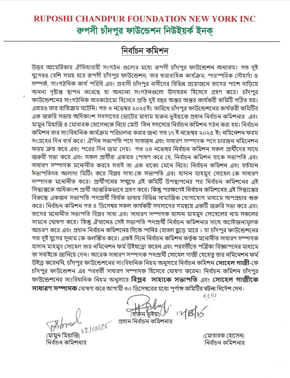 সাধারণ সম্পাদক পদে নির্বাচিত ঘোষণা করা হয়েছে। ৩ সদস্য বিশিষ্ট নির্বাচন কমিশন প্ররিত উক্ত বিজ্ঞপ্তিতে প্রধান নির্বাচন কমিশনার হারুন ভুঁইয়া ছাড়াও স্বাক্ষর করেন কমিশেনর অপর সদস্য ও সংগঠনের সাবেক সভাপতি মামুন মিয়াজী। আগামী দিনকয়েকের মধ্যে সংগঠনের গঠনতন্ত্র অনুযায়ী রুপসী চাঁদপুর ফাউন্ডেশনের নবনির্বািচত সভাপতি বিপ্লব সাহা ও সাধারণ সম্পাদক সোহেল গাজী পুর্ণাঙ্গ কার্যকরী কমিটির নাম ঘোষণা করবেন।